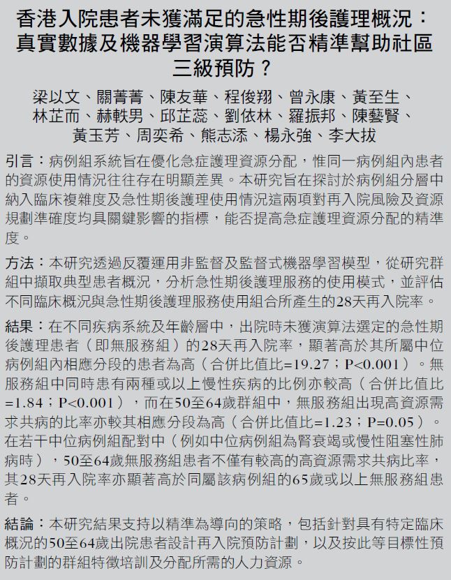 Profiling unmet post–acute care needs of an inpatient population in Hong Kong: can real-world data and machine learning algorithms bring precision to tertiary prevention in the community?