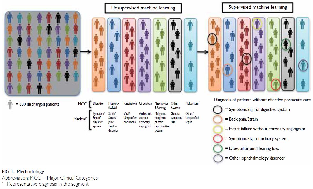 Methods: Through iterative applications of unsupervised and supervised machine learning models, we extracted typical patient profiles from the study populations, analysed post–acute care utilisation patterns, and assessed the 28-day rehospitalisation rates resulting from different pairings between clinical profiles and post–acute care service utilisation patterns.