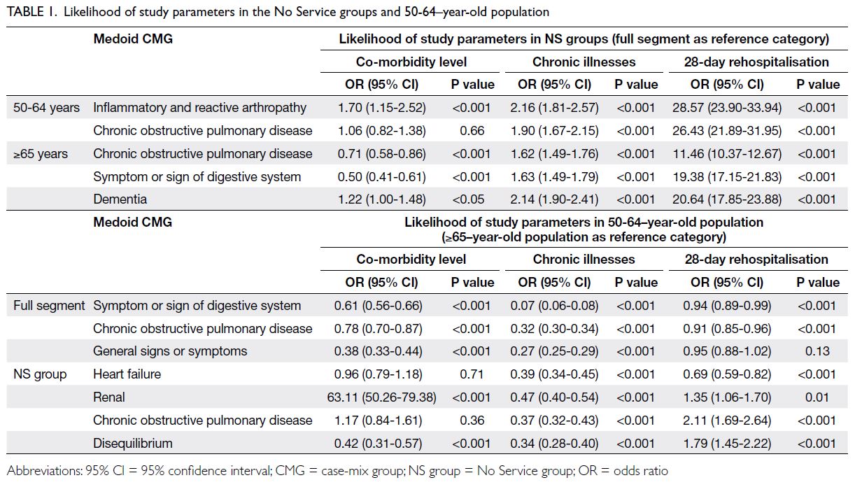 Results: Across various disease systems and age-groups, patients discharged without receiving algorithm-selected post–acute care (ie, No Service groups [NS groups]) showed significantly higher 28-day rehospitalisation rates relative to their corresponding segments in the same medoid case-mix groups (CMGs; pooled odds ratio [OR]=19.27; P<0.001). The NS groups also demonstrated higher rates of having two or more chronic diseases (pooled OR=1.84; P<0.001) and—for the 50-64–year-old population—resource-intensifying co-morbidities (pooled OR=1.23; P=0.05). Patients displaying higher rates of resource-intensifying co-morbidities compared with their ≥65-year-old counterparts (such as when the medoid CMG was renal failure or chronic obstructive pulmonary disease) also exhibited significantly higher 28-day rehospitalisation rates than the ≥65–year-old NS groups sharing the same medoid CMGs.