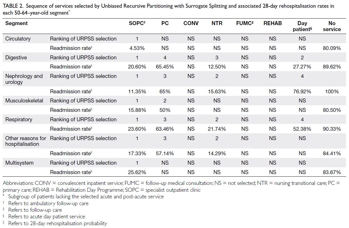 Table 2. Sequence of services selected by Unbiased Recursive Partitioning with Surrogate Splitting and associated 28-day rehospitalisation rates in each 50-64–year-old segment