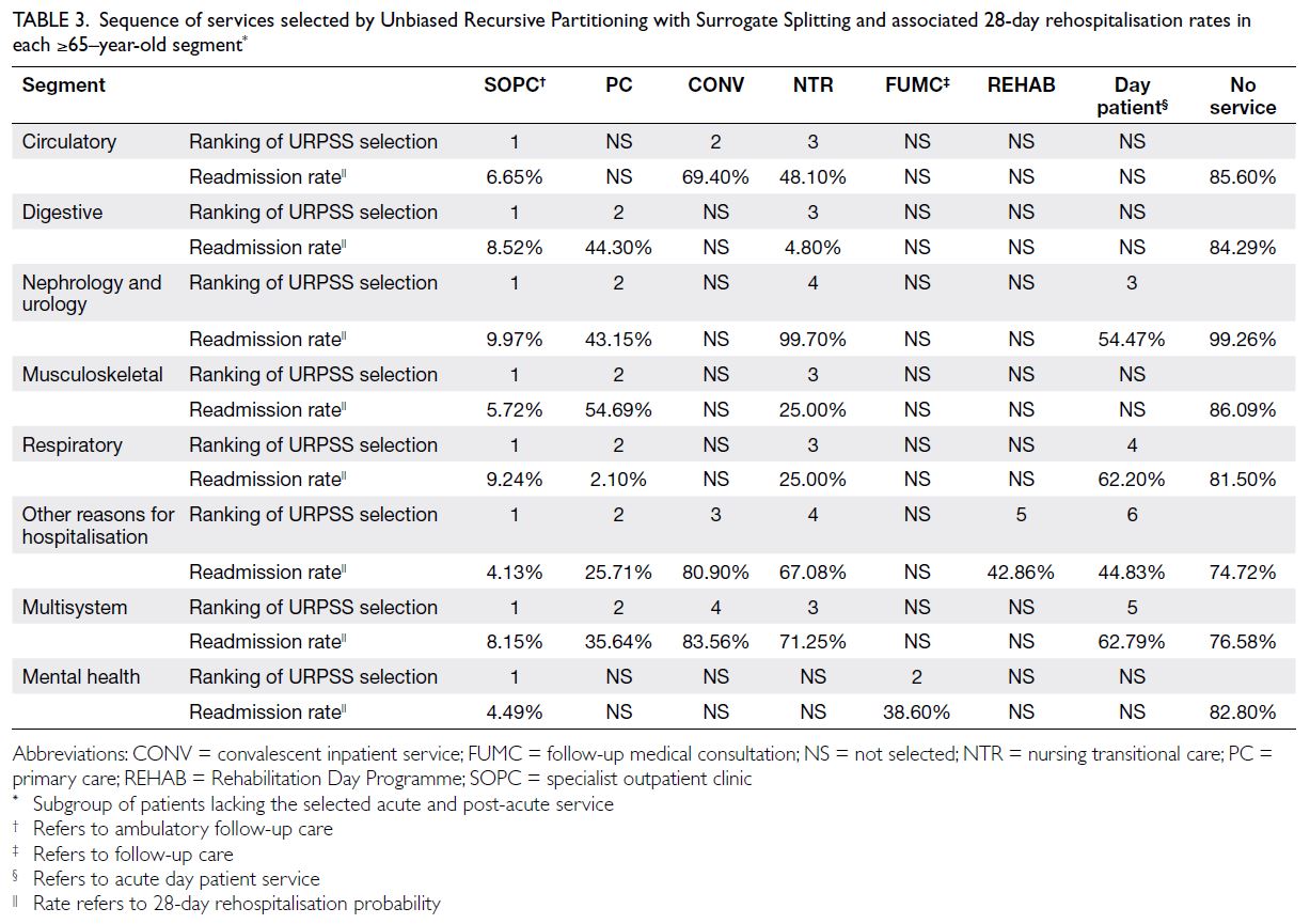 Table 3. Sequence of services selected by Unbiased Recursive Partitioning with Surrogate Splitting and associated 28-day rehospitalisation rates in each ≥65–year-old segment