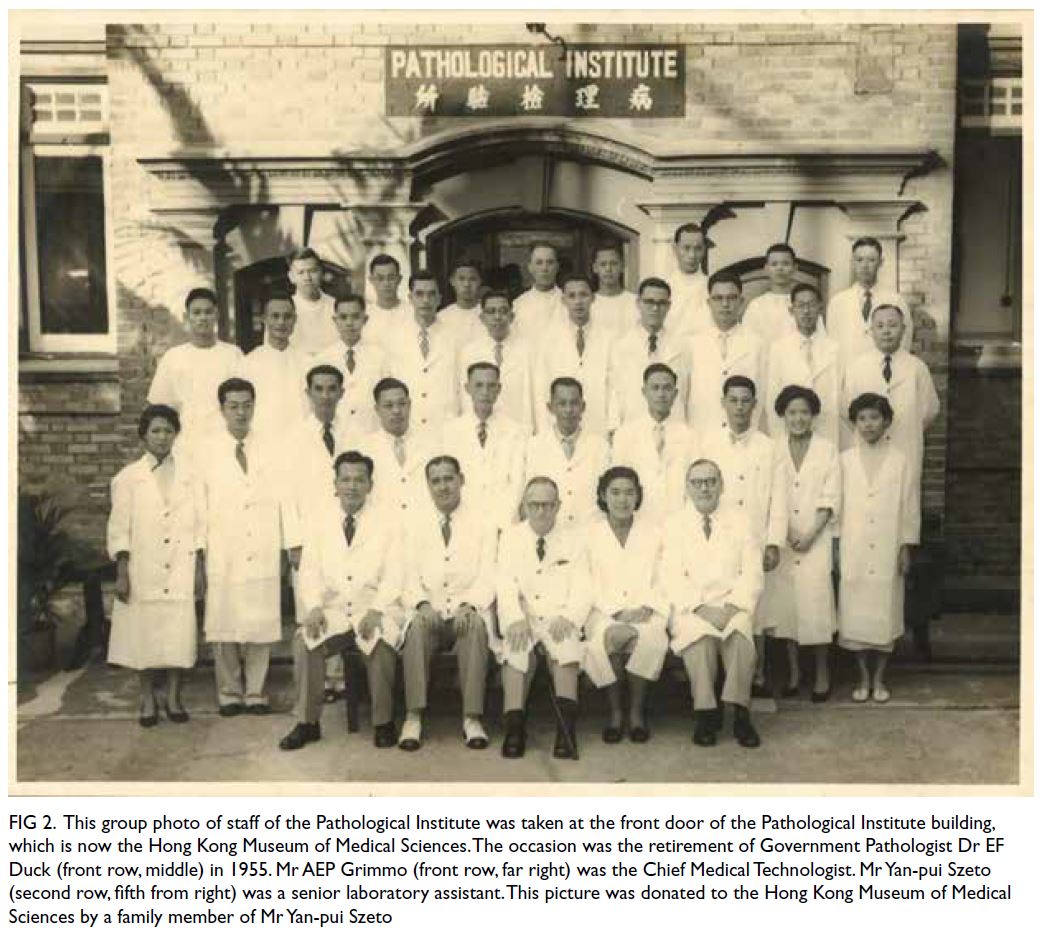 Figure 2. This group photo of staff of the Pathological Institute was taken at the front door of the Pathological Institute building, which is now the Hong Kong Museum of Medical Sciences. The occasion was the retirement of Government Pathologist Dr EF Duck (front row, middle) in 1955. Mr AEP Grimmo (front row, far right) was the Chief Medical Technologist. Mr Yan-pui Szeto (second row, fifth from right) was a senior laboratory assistant. This picture was donated to the Hong Kong Museum of Medical Sciences by a family member of Mr Yan-pui Szeto