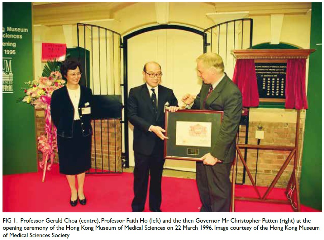 Figure 1. Professor Gerald Choa (centre), Professor Faith Ho (left) and the then Governor Mr Christopher Patten (right) at the opening ceremony of the Hong Kong Museum of Medical Sciences on 22 March 1996. Image courtesy of the Hong Kong Museum of Medical Sciences Society