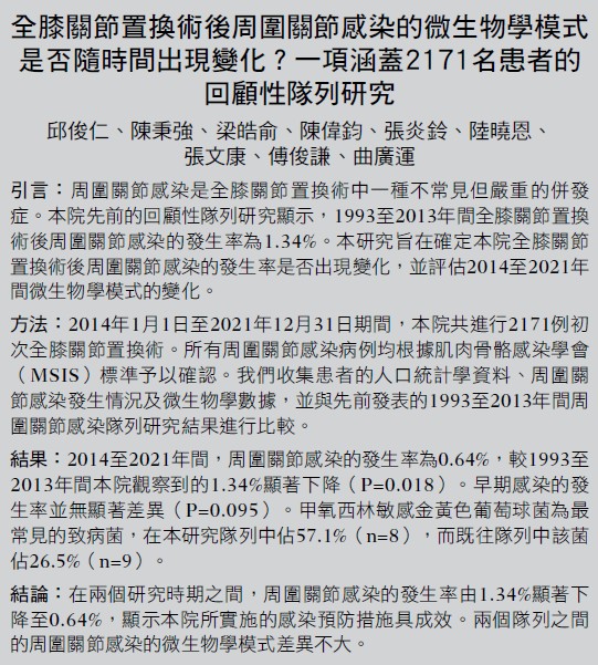 4. Siu KT, Ng FY, Chan PK, Fu H, Yan CH, Chiu KY. Bacteriology and risk factors associated with periprosthetic joint infection after primary total knee arthroplasty: retrospective study of 2543 cases. Hong Kong Med J 2018;24:152-7.