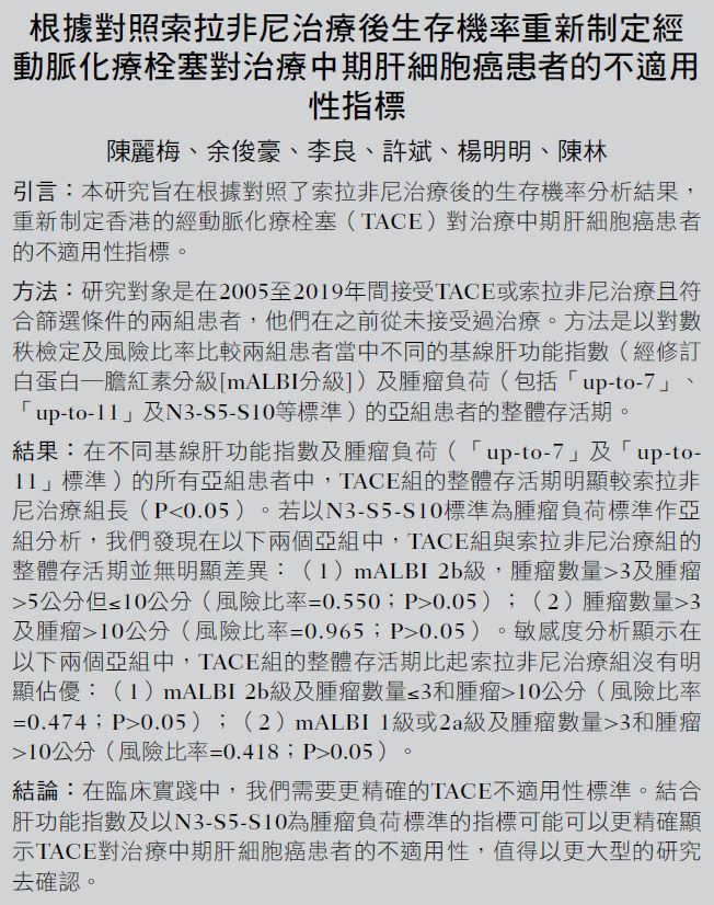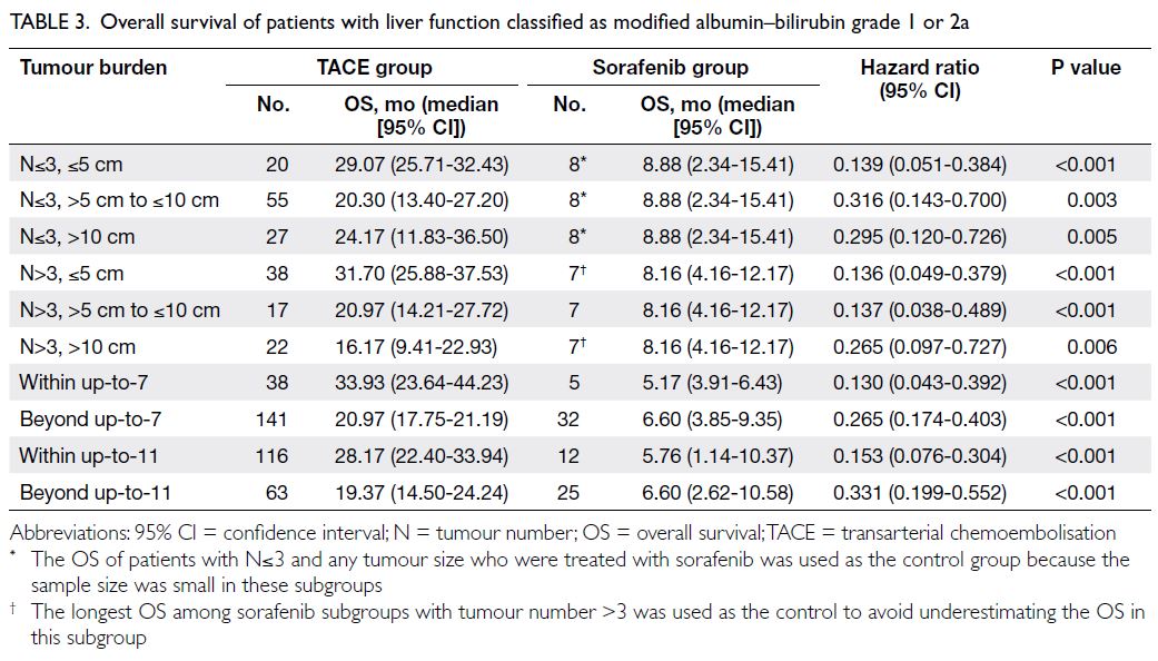 - Patients regarded as unsuitable for transarterial chemoembolisation (TACE) under existing criteria may achieve better survival outcomes with TACE than those with systemic therapy.