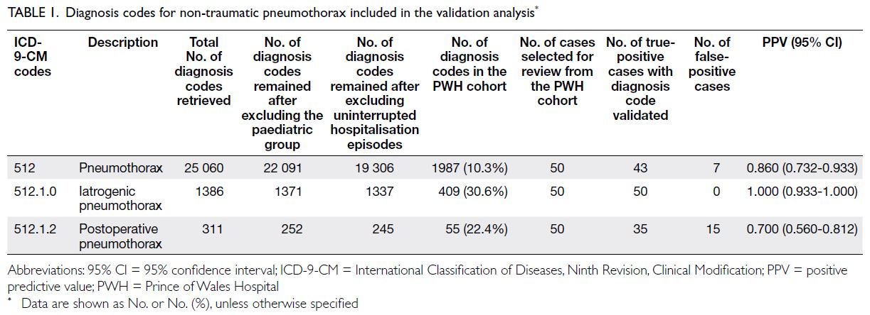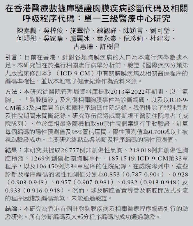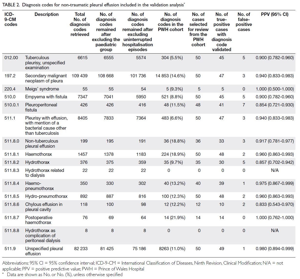 - This is the first validation study of clinical codes (International Classification of Diseases, Ninth Revision, Clinical Modification) for pleural diseases and relevant procedures in Hong Kong.