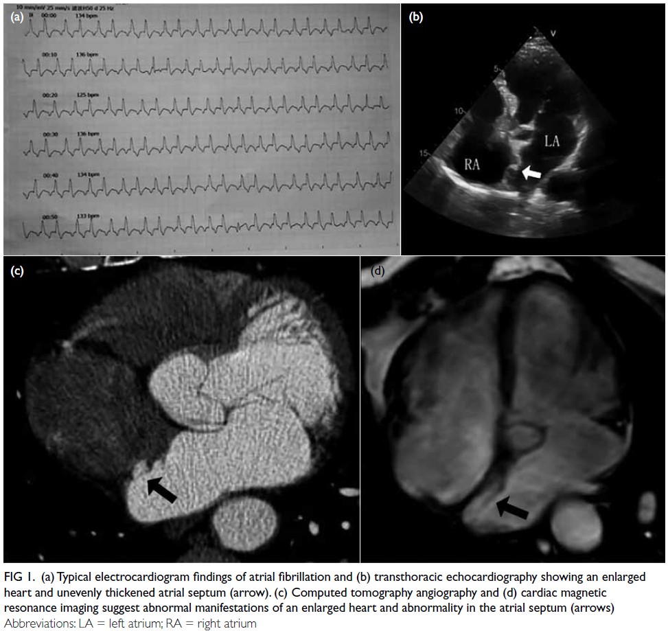 Figure 1. (a) Typical electrocardiogram findings of atrial fibrillation and (b) transthoracic echocardiography showing an enlarged heart and unevenly thickened atrial septum (arrow). (c) Computed tomography angiography and (d) cardiac magnetic resonance imaging suggest abnormal manifestations of an enlarged heart and abnormality in the atrial septum (arrows)