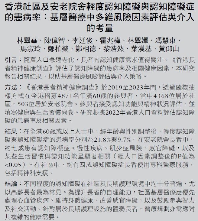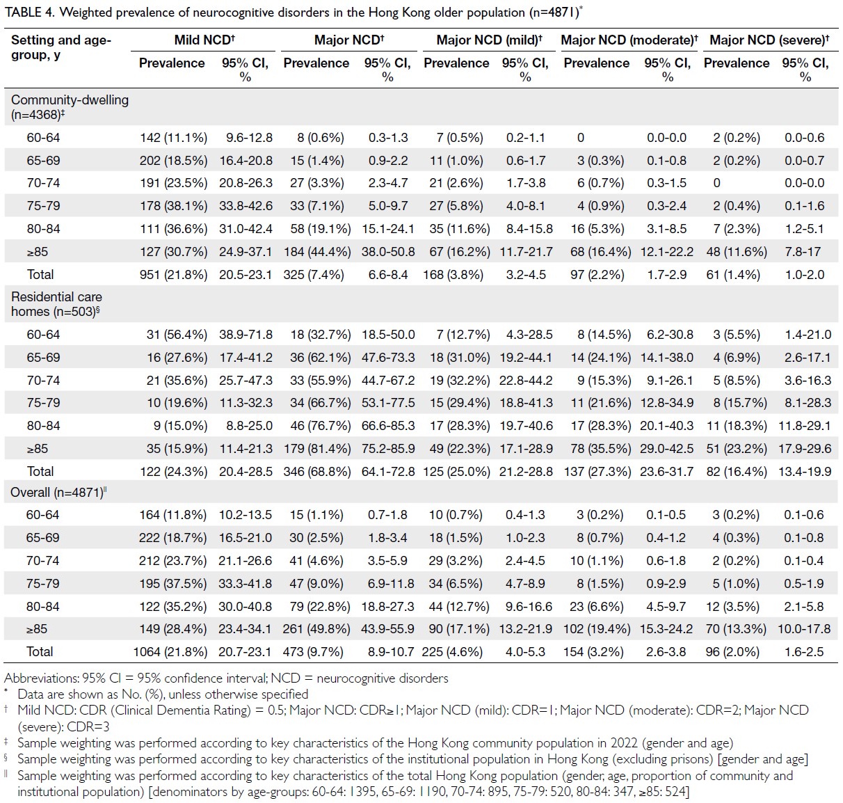 - The study revealed that 9.7% of older adults had major neurocognitive disorders (NCD), and nearly one in five older adults had mild NCD in Hong Kong. The high prevalence of mild NCD warrants attention, particularly from the perspective of early management to reduce progression from functionally independent mild NCD to dependent states of major NCD.