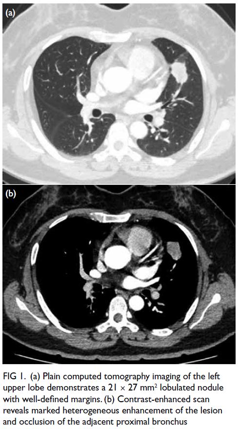 Figure 1. (a) Plain computed tomography imaging of the left upper lobe demonstrates a 21 × 27 mm2 lobulated nodule with well-defined margins. (b) Contrast-enhanced scan reveals marked heterogeneous enhancement of the lesion and occlusion of the adjacent proximal bronchus