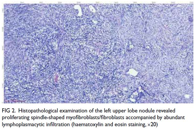 Figure 2. Histopathological examination of the left upper lobe nodule revealed proliferating spindle-shaped myofibroblasts/fibroblasts accompanied by abundant lymphoplasmacytic infiltration (haematoxylin and eosin staining, ×20)