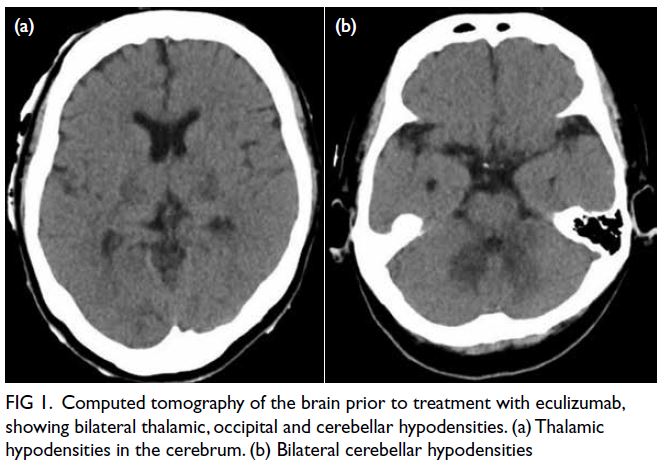 Figure 1. Computed tomography of the brain prior to treatment with eculizumab, showing bilateral thalamic, occipital and cerebellar hypodensities. (a) Thalamic hypodensities in the cerebrum. (b) Bilateral cerebellar hypodensities