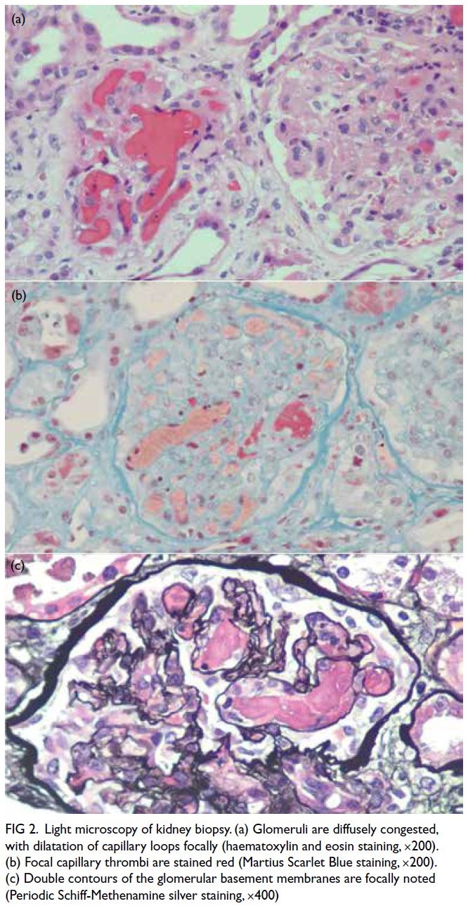Figure 2. Light microscopy of kidney biopsy. (a) Glomeruli are diffusely congested, with dilatation of capillary loops focally (haematoxylin and eosin staining, ×200). (b) Focal capillary thrombi are stained red (Martius Scarlet Blue staining, ×200). (c) Double contours of the glomerular basement membranes are focally noted (Periodic Schiff-Methenamine silver staining, ×400)