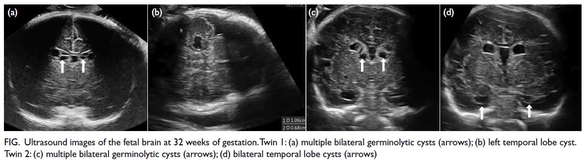 Figure. Ultrasound images of the fetal brain at 32 weeks of gestation. Twin 1: (a) multiple bilateral germinolytic cysts (arrows); (b) left temporal lobe cyst. Twin 2: (c) multiple bilateral germinolytic cysts (arrows); (d) bilateral temporal lobe cysts (arrows)