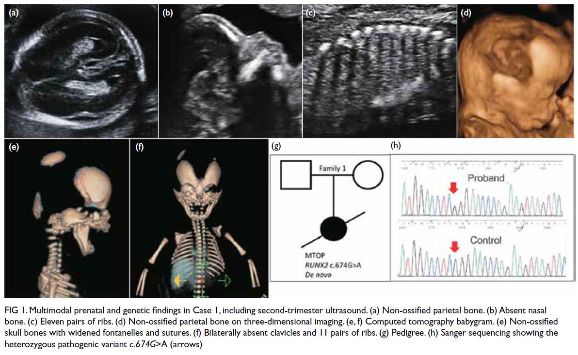 Figure 1. Multimodal prenatal and genetic findings in Case 1, including second-trimester ultrasound. (a) Non-ossified parietal bone. (b) Absent nasal bone. (c) Eleven pairs of ribs. (d) Non-ossified parietal bone on three-dimensional imaging. (e, f) Computed tomography babygram. (e) Non-ossified skull bones with widened fontanelles and sutures. (f) Bilaterally absent clavicles and 11 pairs of ribs. (g) Pedigree. (h) Sanger sequencing showing the heterozygous pathogenic variant c.674G>A (arrows)