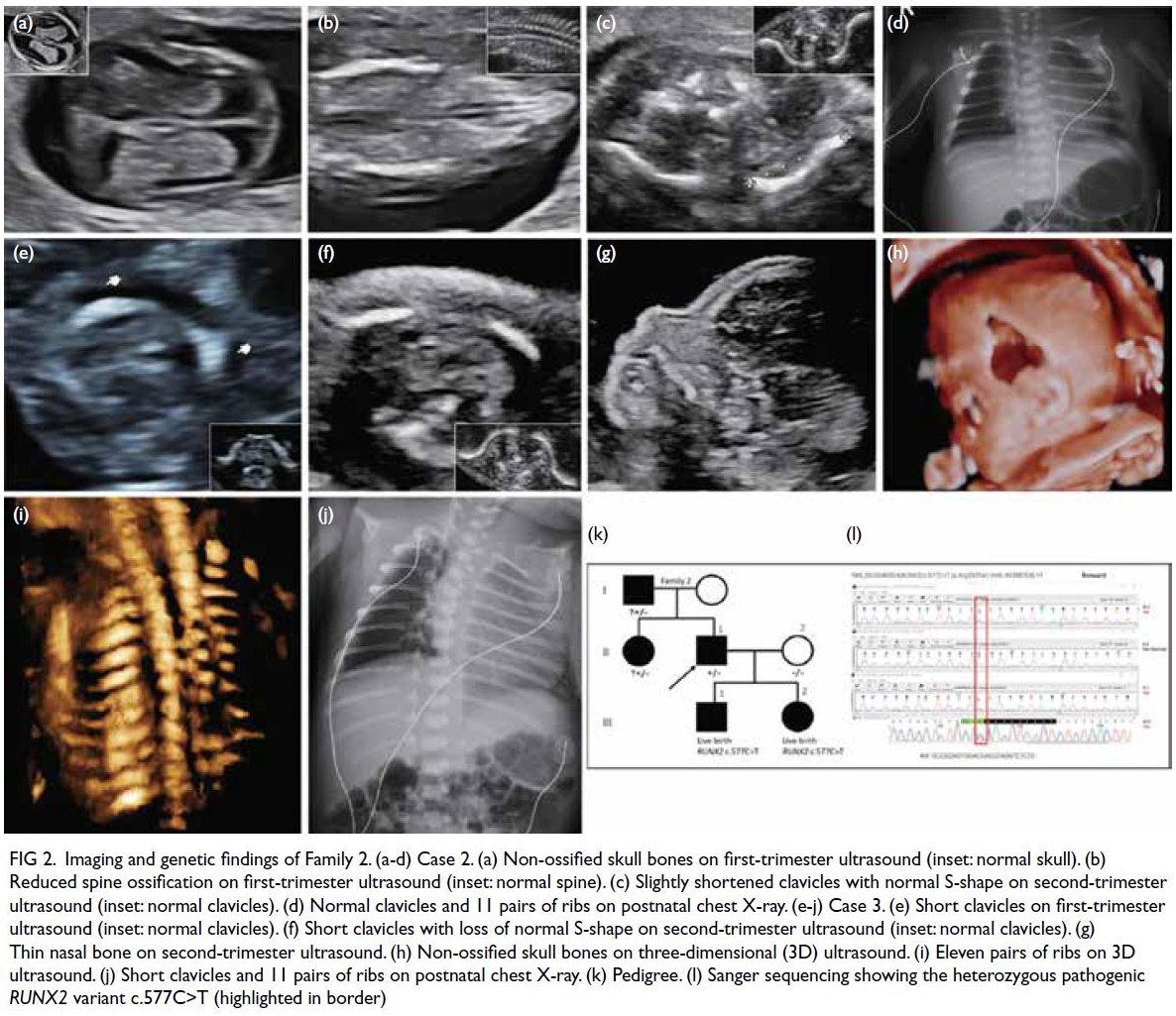 Figure 2. Imaging and genetic findings of Family 2. (a-d) Case 2. (a) Non-ossified skull bones on first-trimester ultrasound (inset: normal skull). (b) Reduced spine ossification on first-trimester ultrasound (inset: normal spine). (c) Slightly shortened clavicles with normal S-shape on second-trimester ultrasound (inset: normal clavicles). (d) Normal clavicles and 11 pairs of ribs on postnatal chest X-ray. (e-j) Case 3. (e) Short clavicles on first-trimester ultrasound (inset: normal clavicles). (f) Short clavicles with loss of normal S-shape on second-trimester ultrasound (inset: normal clavicles). (g) Thin nasal bone on second-trimester ultrasound. (h) Non-ossified skull bones on three-dimensional (3D) ultrasound. (i) Eleven pairs of ribs on 3D ultrasound. (j) Short clavicles and 11 pairs of ribs on postnatal chest X-ray. (k) Pedigree. (l) Sanger sequencing showing the heterozygous pathogenic RUNX2 variant c.577C>T (highlighted in border)
