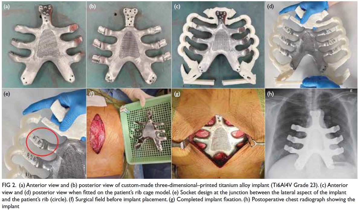 Figure 2. (a) Anterior view and (b) posterior view of custom-made three-dimensional–printed titanium alloy implant (Ti6Al4V Grade 23). (c) Anterior view and (d) posterior view when fitted on the patient’s rib cage model. (e) Socket design at the junction between the lateral aspect of the implant and the patient’s rib (circle). (f) Surgical field before implant placement. (g) Completed implant fixation. (h) Postoperative chest radiograph showing the implant