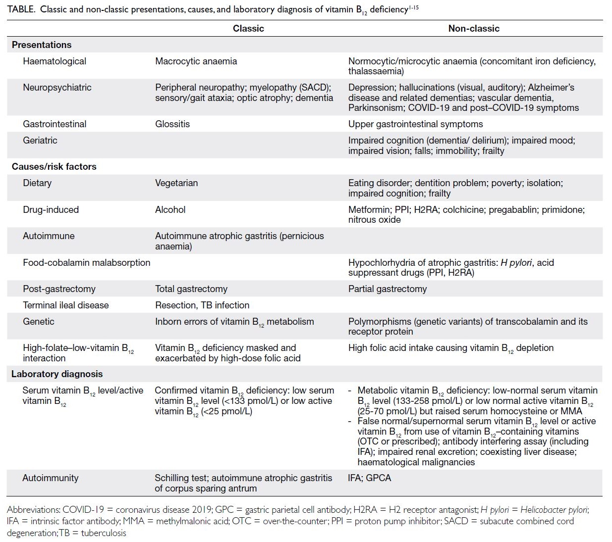 Table. Classic and non-classic presentations, causes, and laboratory diagnosis of vitamin B12 deficiency1 2 3 4 5 6 7 8 9 10 11 12 13 14 15