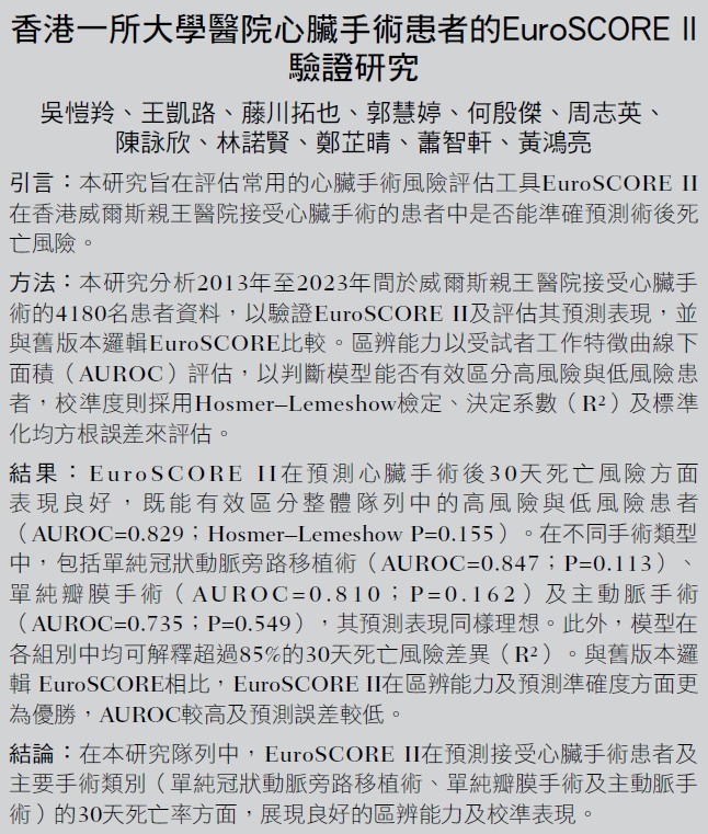 - The European System for Cardiac Operative Risk Evaluation (EuroSCORE) II demonstrates strong discriminatory ability and good calibration for predicting 30-day mortality among patients undergoing cardiac surgery at Prince of Wales Hospital (PWH) in Hong Kong.